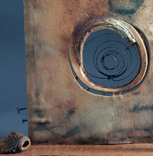 Spiral Center 19" h x 24 x 5 1/2 clay, salts, wood, jute, hand-forged nails, steel