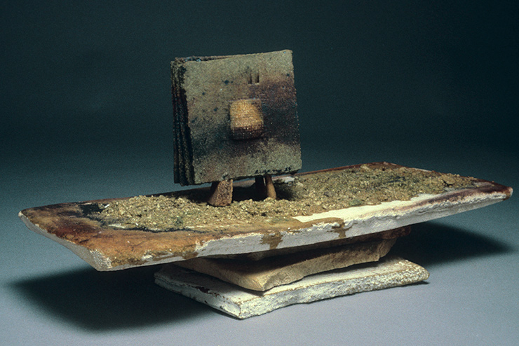Moontide clay 18 1/2" h x 30 x 3 clay, burnt wood, linen, steel