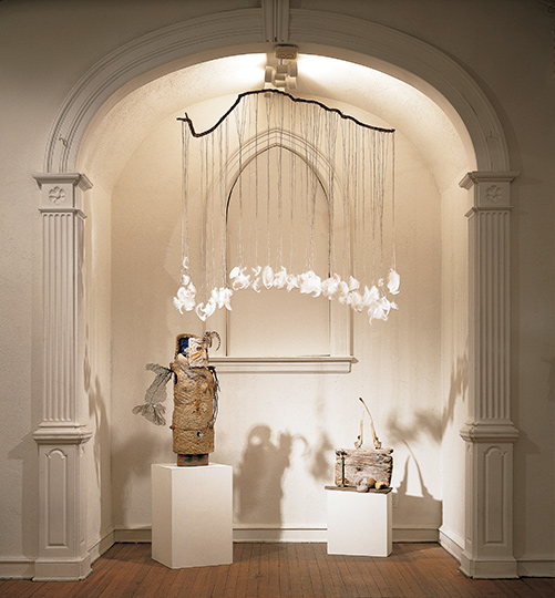 Alcyone 36" h x 19 x 10 recycled paper, wire, bone, feathers, found objects, photos