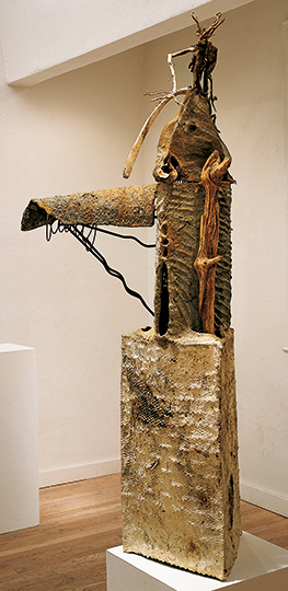 Ancestor 67" h x 30 x 33 paper pulp, wire, steel, bone, photos, feathers, earth