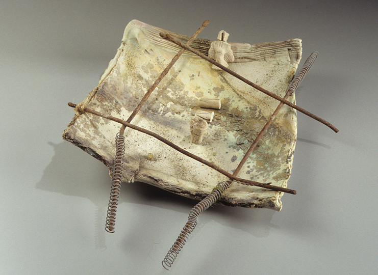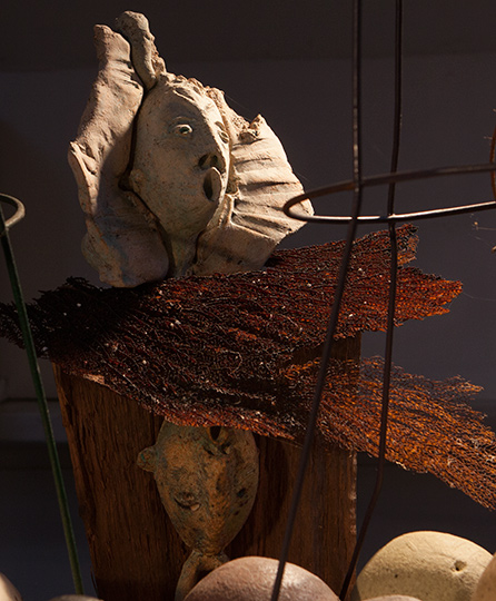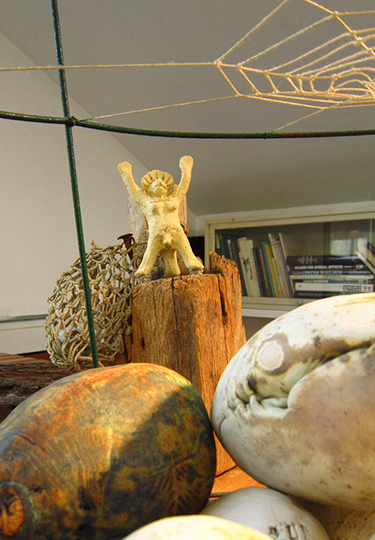 Poet's Playground 13"h x 20 x 16 clay, bones, linen thread, swan feather