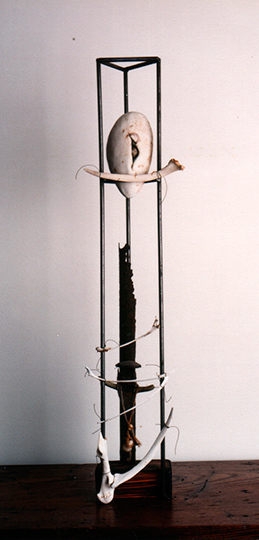 Bone Totem 25" h x 5 x 4 1/2 steel, clay, bone, wood, linen thread