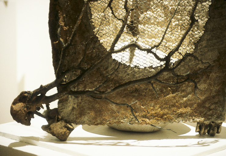 Rebirth 39" h x 18 x 21 paper pulp, wire, bone, photos, earth, found objects