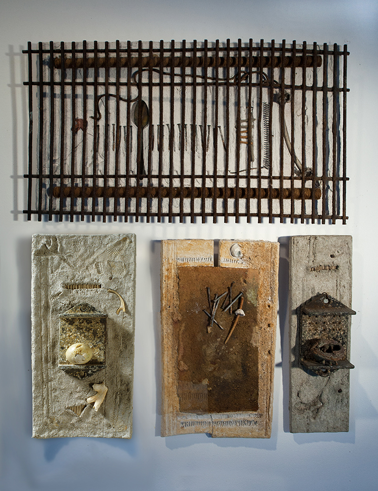Time Sequence mixed media 31"h x 25 x 3 paper pulp, wood, steel bones ,clay, rope, found objects